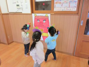 「鬼は外!福は内!」と大きな声を出しながら豆まきを楽しんだり、集合写真を撮りました。鬼の壁面に向けてカラーボールを投げたり、新聞紙のボールを投げました。