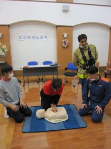 高槻北消防署職員の方より緊急時対応方法とAEDの使用方法について教えていただきました。