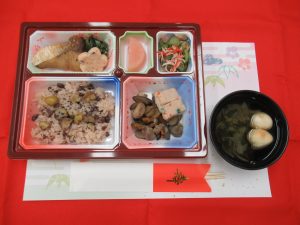 ・栗赤飯・ブリの照り焼き・お煮しめ・胡瓜の酢の物・イカ袱紗焼き・梅羊羹